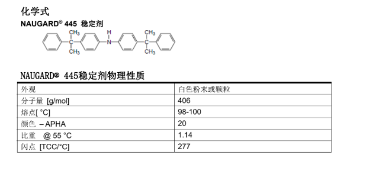 Naugard ?445是二苯胺類高效抗氧劑、熱穩(wěn)定劑、橡膠防老劑,有效保護塑料及橡膠等免受熱和氧的破壞。